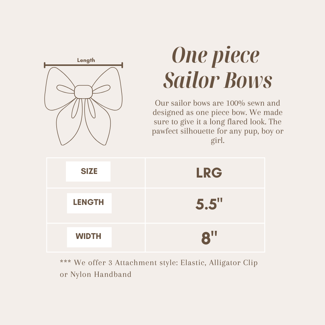 Our Sailor Hair Bows are designed to easily slip onto your pups collar with elastic loops sewn in. All Hair Bows are 100% sewn and one piece crafted for bigger bolder statements.