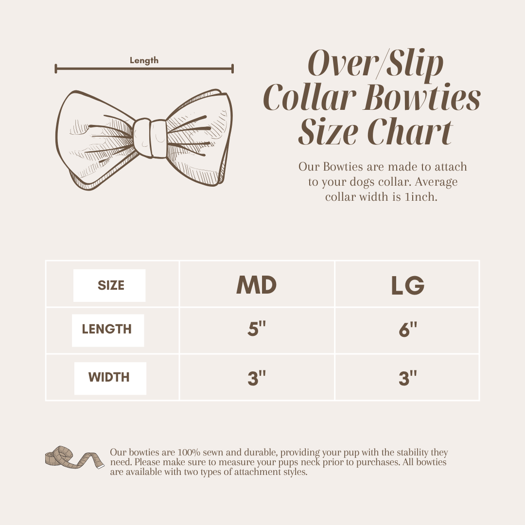 Bowtie sizing can vary based on how long you want it to look. As a result, we recommend to refer to our size guide below. Our Handmade Bowties are made to tie around your dogs collar with either velcro or elastic. Dogs under 25lbs typically wear a medium, and dogs over 25lbs wear a large.
