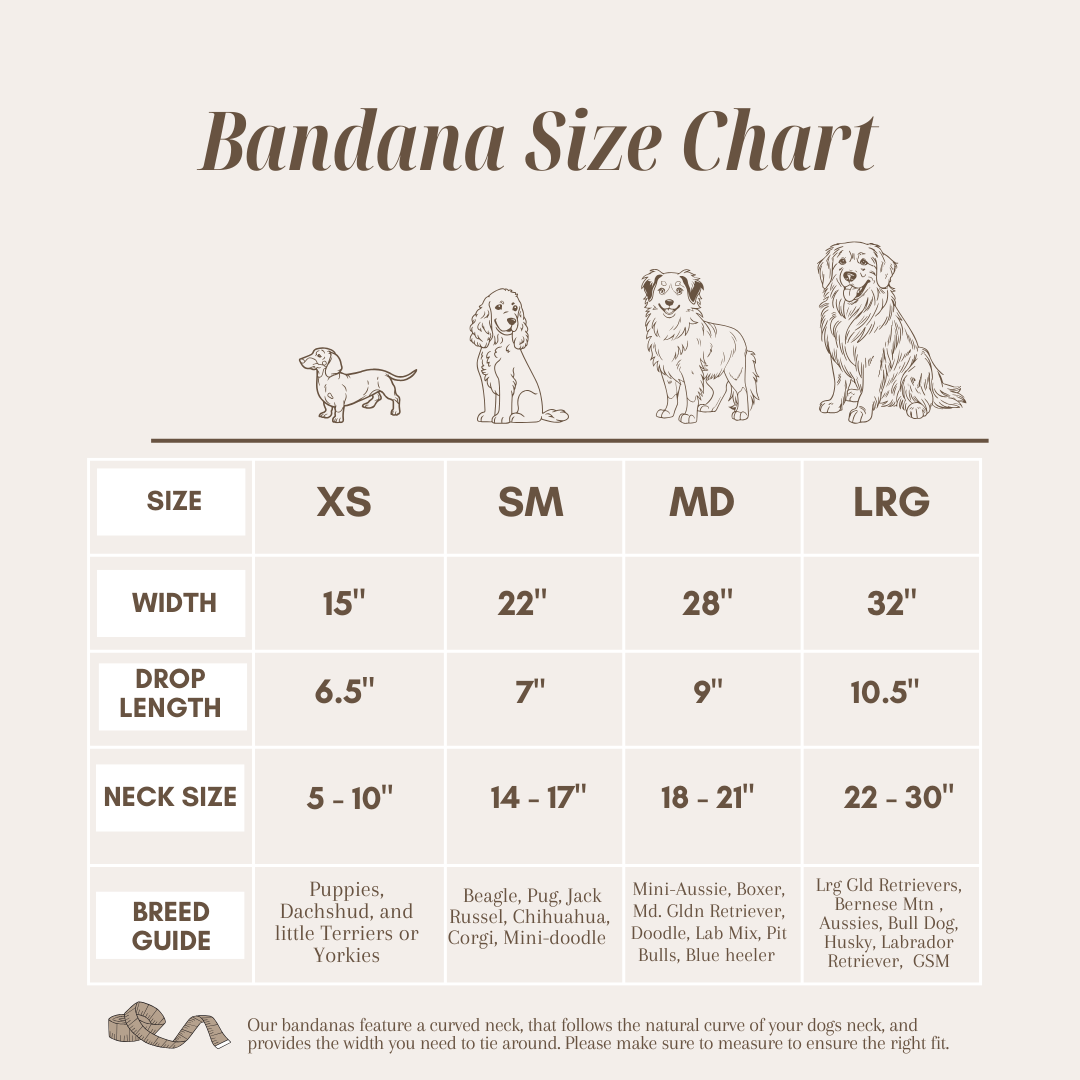 Finding the right size for your dog can be tricky; we recommend to measure around your dog's neck and refer to our size guide. Our Reversible Bandanas are made to tie around the back of your dog’s neck, and typically run bigger than most bandanas. My recommendation is to size up if you fall between sizes or have a fluffy dog.